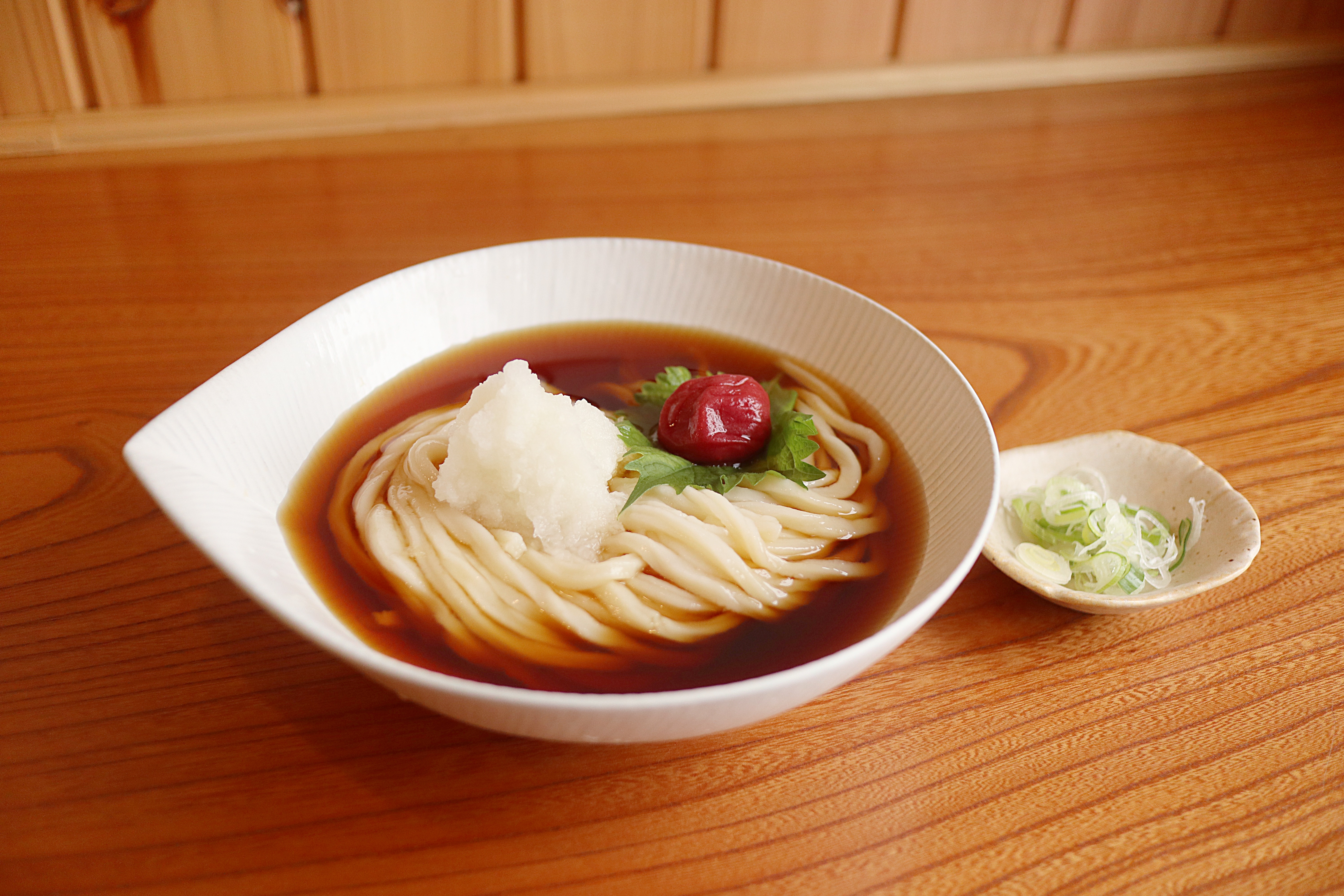 おろしうどんに梅干し入り。大分県産無添加の梅干し使用。