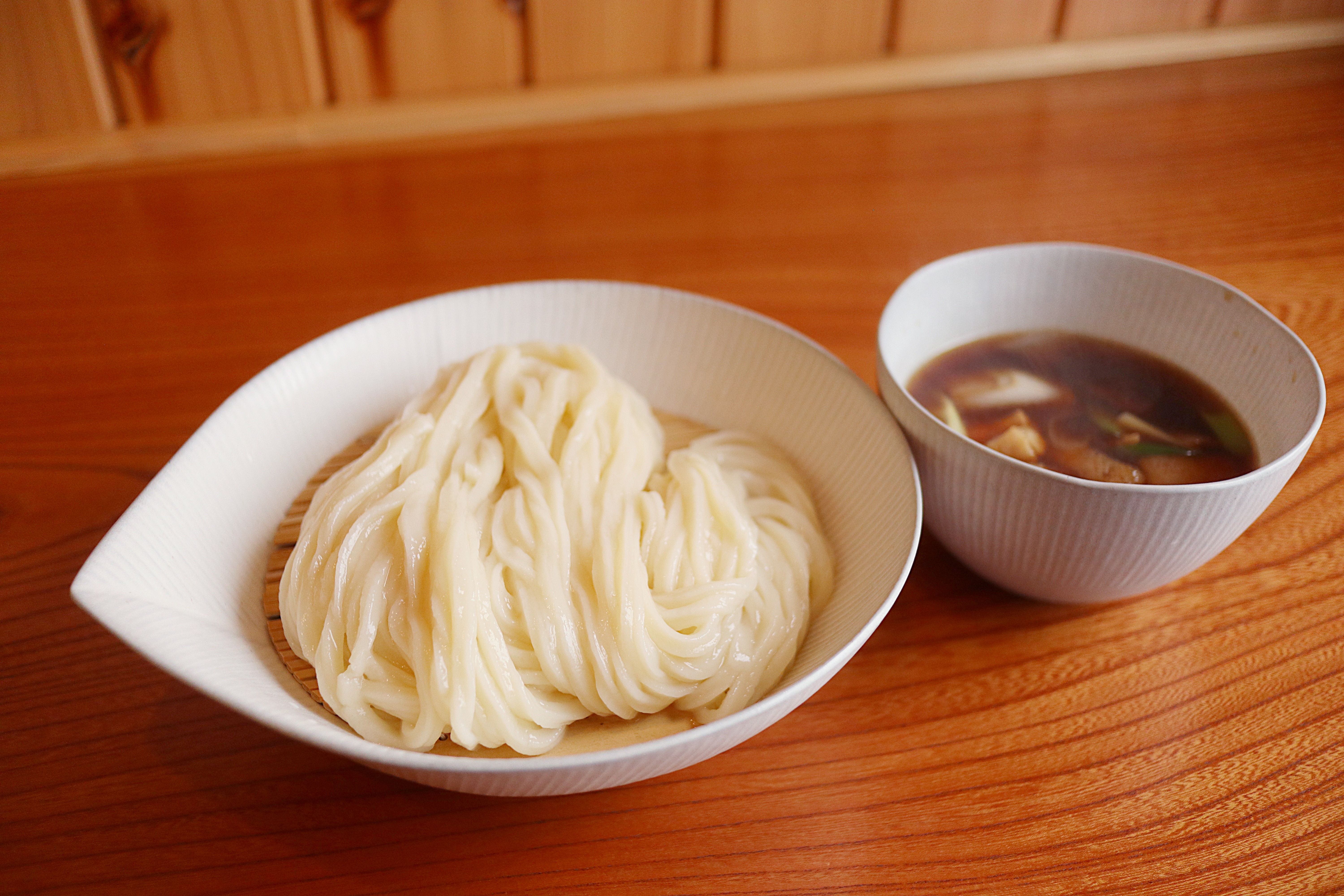 つけ麺です。麺はざる、鳥肉、椎茸、揚げ、ネギがたっぷり入った温出汁に付けて召し上がってください。